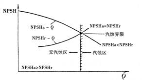 从图3的曲线可见:NPSHa和NPSHr均随流量(Q)的变化而变化。一般NPSHr随流量的增加而增大,而NPSHa则随流量的增加而减小。